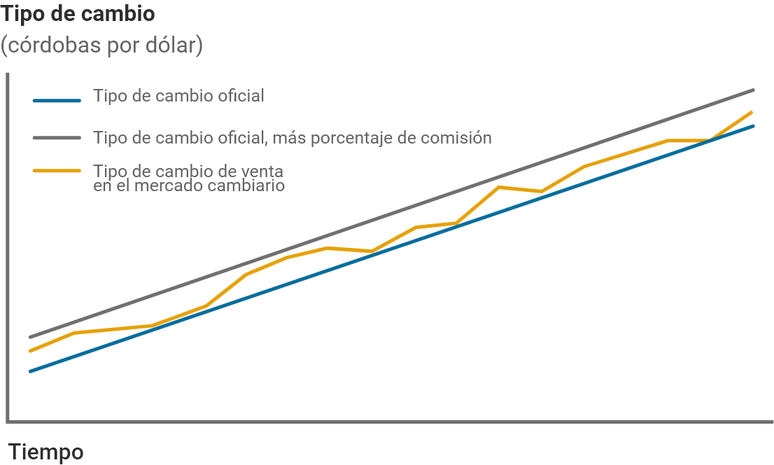 El BCN compra los dólares ofrecidos por el sistema financiero al tipo de cambio oficial del día, mediante una mesa de cambio. Asimismo, mediante la mesa de cambio el BCN vende los dólares demandados por el sistema financiero al tipo de cambio oficial más una comisión cambiaria.