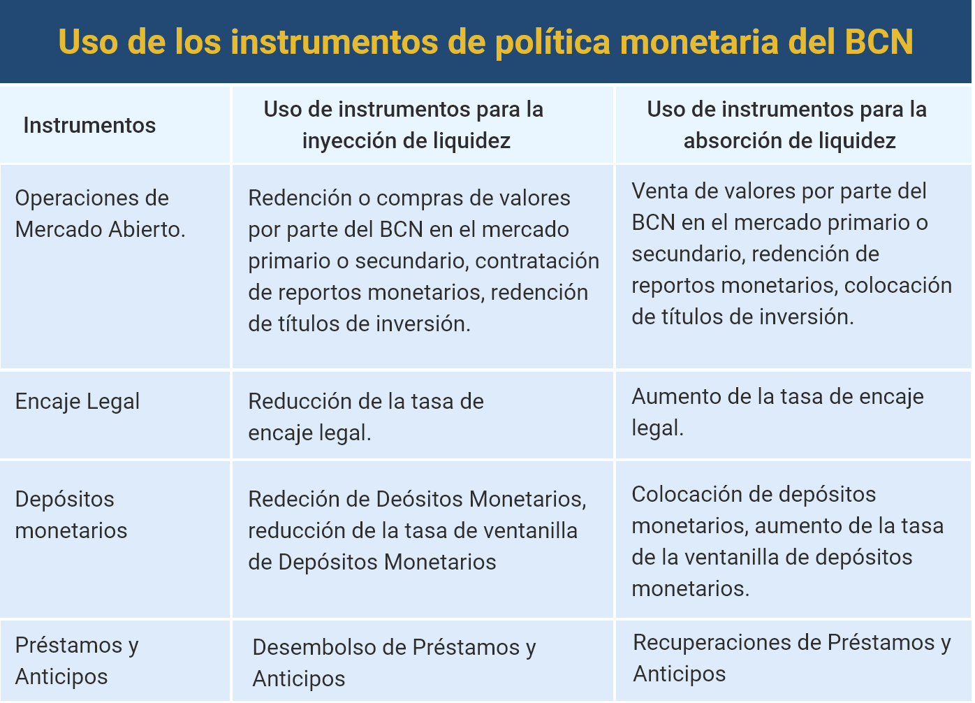El BCN conduce la política monetaria utilizando los instrumentos siguientes: las operaciones de mercado abierto, el encaje legal, los depósitos monetarios y los préstamos y anticipos de liquidez. Con estos instrumentos el Banco procura preservar la estabilidad de las reservas internacionales y las condiciones de liquidez de la economía, apuntando a mantenerlas estables y, de esta forma, incidir en las tasas de interés del mercado interbancario.