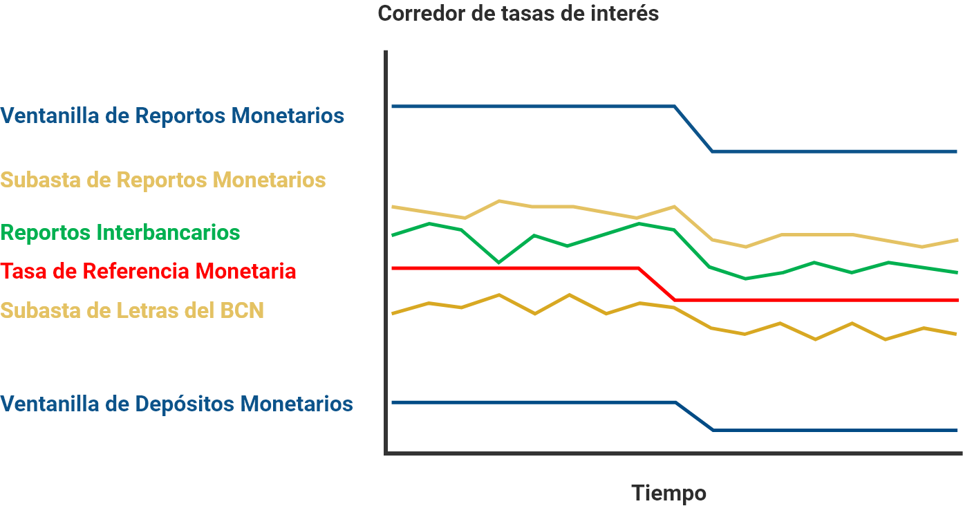 La instrumentación de las ventanillas de reportos monetarios y de depósitos monetarios para operaciones de corto plazo produce un corredor de tasas de interés fijado por el BCN, en donde la tasa de interés para la ventanilla de reportos monetarios constituye el límite superior del corredor para inyecciones de liquidez, mientras que la tasa de interés de la ventanilla de depósitos monetarios constituye el piso o límite inferior del corredor para absorción de liquidez. El BCN establece además una Tasa de Referencia Monetaria (TRM), que es la tasa de interés que utiliza como referencia para señalizar el costo en córdobas de las operaciones monetarias de liquidez a 1 día plazo, y que se ubica a lo interno del corredor de tasas de interés.