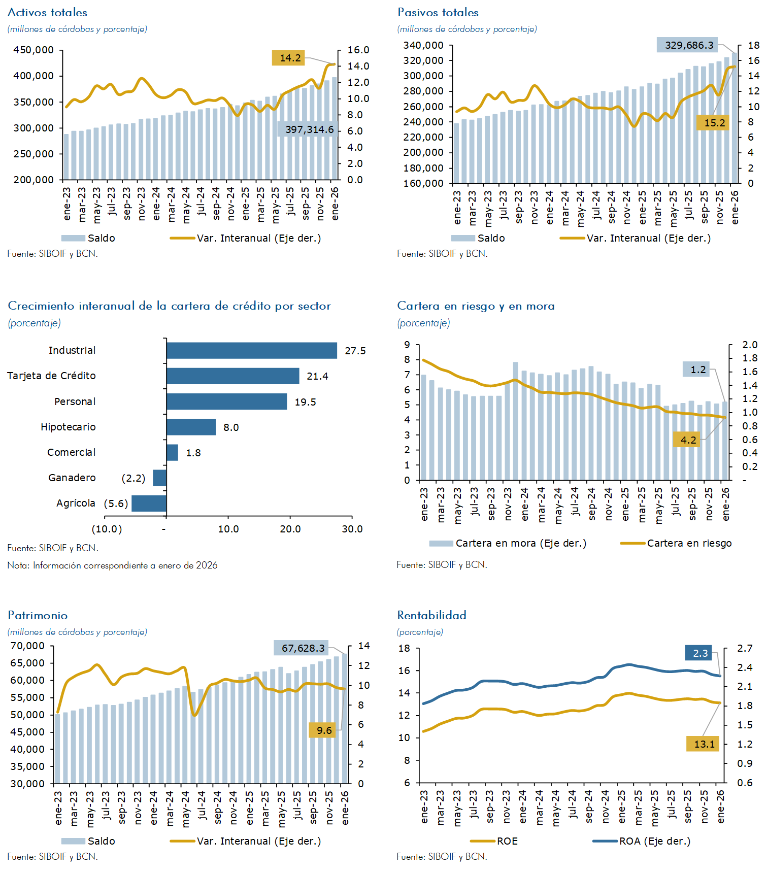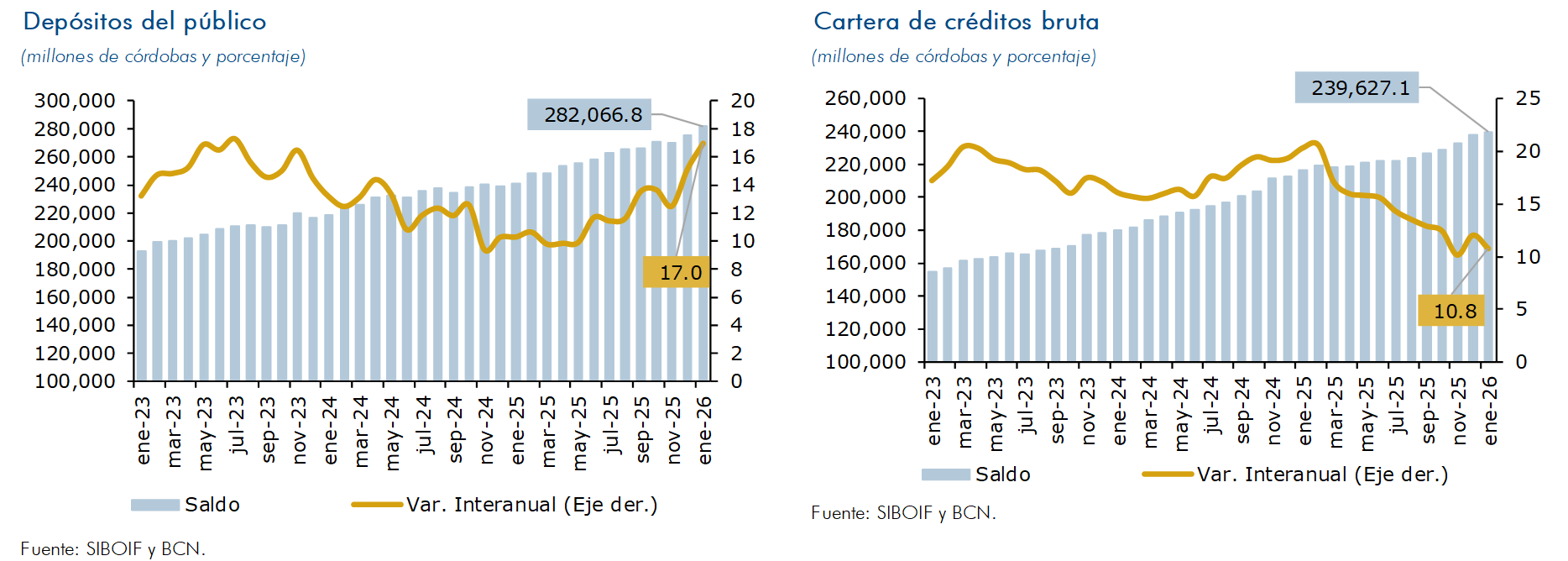 Al cierre de enero de 2026, los depósitos del público registraron un crecimiento de 17.0 por ciento en términos interanuales (saldo de C$282,066.8 millones); mientras la cartera de crédito aumentó en 10.8 por ciento (saldo de C$239,627.1 millones). Las entregas de crédito registraron mejoras en la calidad de la cartera, así, la proporción de la cartera vigente se mantuvo en 95.8 por ciento de la cartera bruta total, mientras el ratio de cartera en mora se ubicó en 1.2 por ciento (1.4% en enero de 2025).