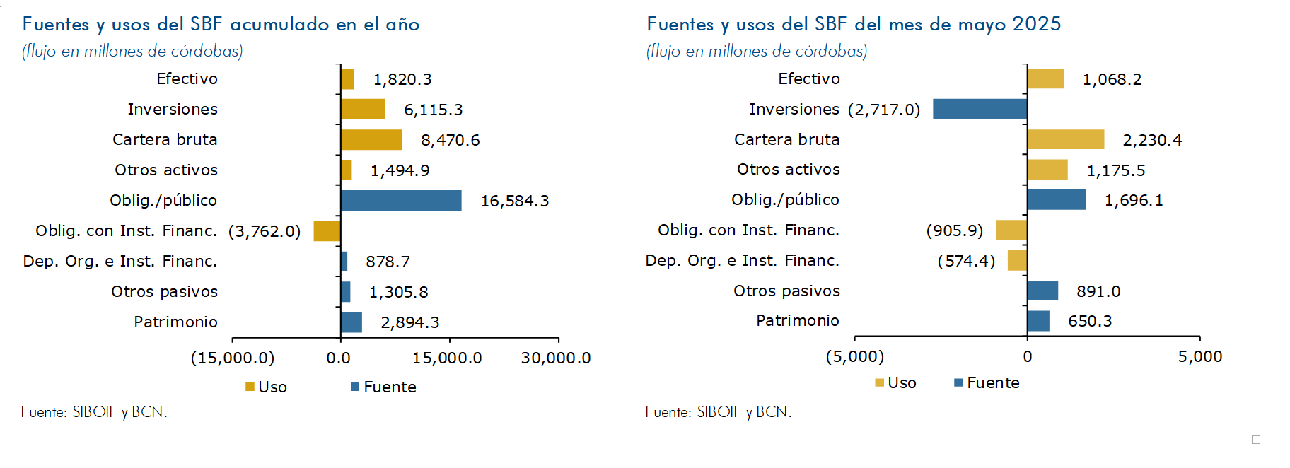 En el acumulado a mayo de 2025, el SBF ha obtenido recursos especialmente a través del aumento de obligaciones con el público (C$16,584.3 millones) y del patrimonio (C$2,894.3 millones). Estos recursos se destinaron esencialmente al aumento de la cartera de créditos (C$8,470.6 millones) y de las inversiones (C$6,115.3 millones), así mismo, también se observó una reducción de obligaciones con instituciones financieras (C$3,762.0 millones).