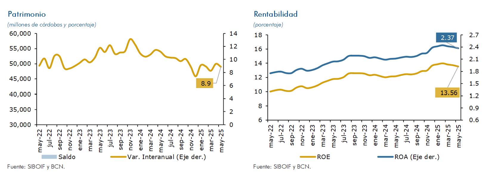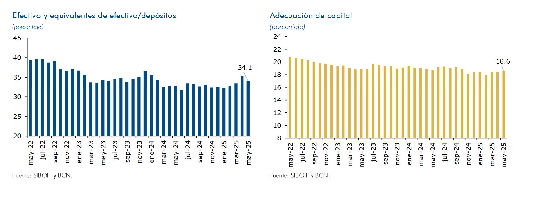 En mayo de 2025, la liquidez del Sistema Bancario y Financieras (SBF), medida como el ratio de efectivo y equivalentes de efectivo sobre depósitos del público, registró un valor de 34.1 por ciento. El encaje legal (medición catorcenal), registró un sobrecumplimiento, tanto en córdobas como en dólares. Así, la tasa efectiva de fin de mes se ubicó en 15.5 por ciento en moneda nacional y 15.5 por ciento en moneda extranjera. Por su parte, el SBF finalizó mayo con un ROE de 13.6 por ciento (12.2% en mayo 2024) y un ROA de 2.4 por ciento (2.1% en mayo 2024). La adecuación de capital del SBF al cierre del mes de mayo fue 18.6 por ciento (18.7% en mayo 2024).