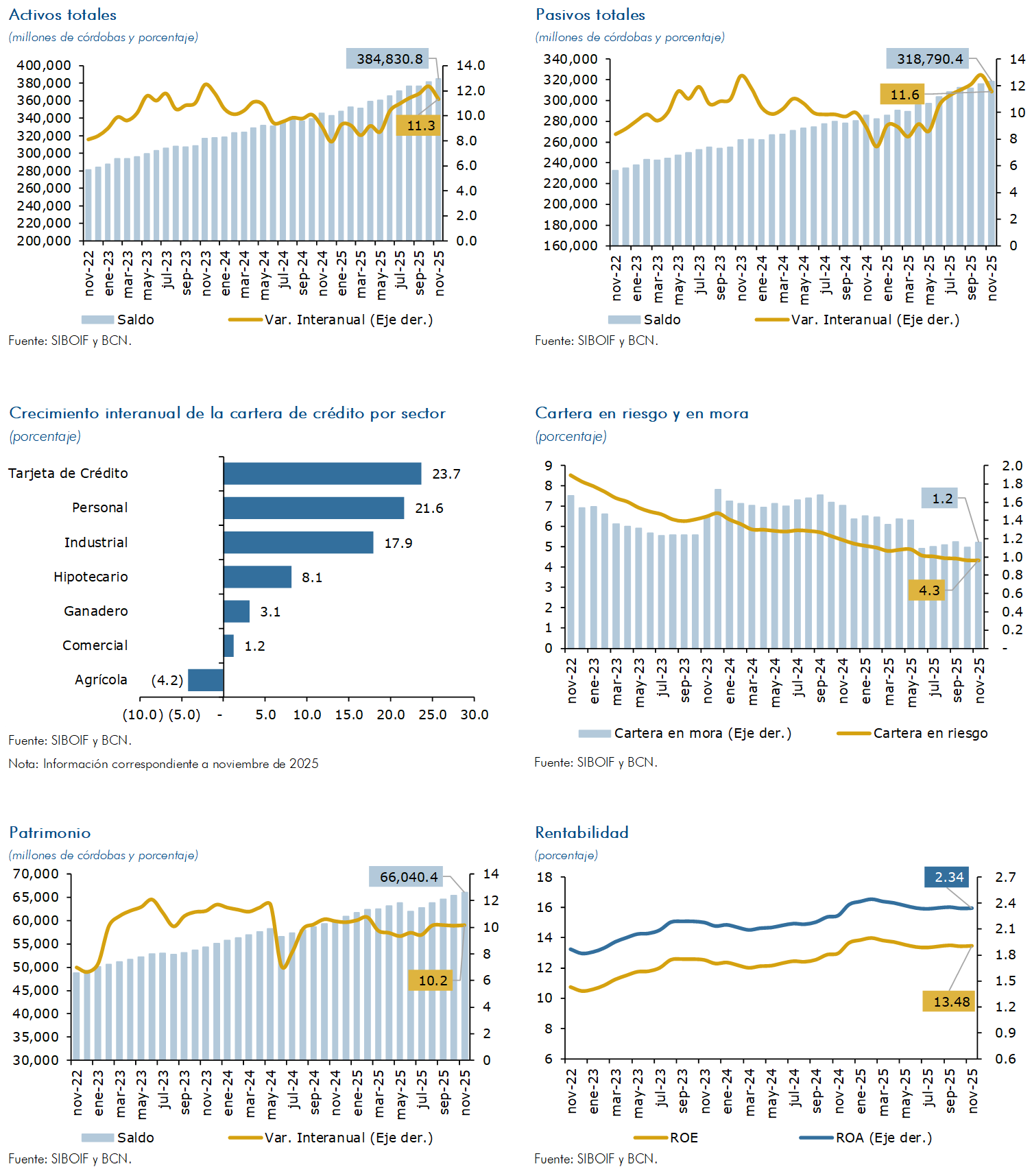 Al cierre de noviembre de 2025, los depósitos del público registraron un crecimiento de 12.5 por ciento en términos interanuales (saldo de C$270,490.7 millones); mientras la cartera de crédito aumentó en 10.2 por ciento (saldo de C$232,742.9 millones). Las entregas de crédito mantuvieron los buenos resultados registrados en la calidad de la cartera, así, la proporción de la cartera vigente se mantuvo en 95.7 por ciento de la cartera bruta total, mientras el ratio de cartera en mora se ubicó en 1.2 por ciento (1.6% en noviembre de 2024).