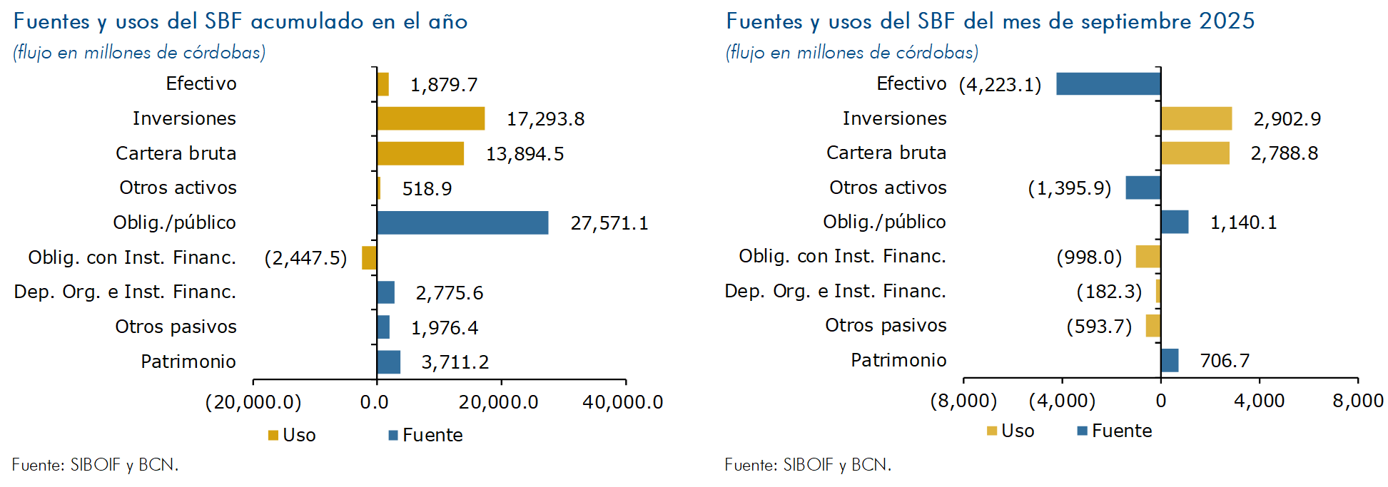 En septiembre, la principal fuente de recursos del SBF provino de la reducción del efectivo (C$4,223.1 millones) y de otros activos (C$1,395.9 millones), así como por el aumento de las obligaciones con el público (C$1,140.1 millones). Dichos recursos se destinaron esencialmente al aumento de inversiones (C$2,902.9 millones) y de la cartera bruta de créditos (C$2,788.8 millones).