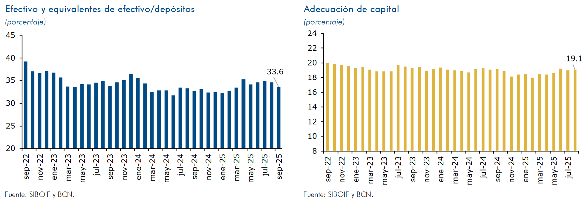En septiembre de 2025, la liquidez del Sistema Bancario y Financieras (SBF), medida como el ratio de efectivo y equivalentes de efectivo sobre depósitos del público, registró un valor de 33.6 por ciento. El encaje legal (medición catorcenal), registró un sobrecumplimiento, tanto en córdobas como en dólares. Así, la tasa efectiva de fin de mes se ubicó en 15.7 por ciento en moneda nacional y 15.6 por ciento en moneda extranjera. Por su parte, el SBF finalizó septiembre con un ROE de 13.5 por ciento (12.6% en septiembre 2024) y un ROA de 2.4 por ciento (2.2% en septiembre 2024). La adecuación de capital del SBF al cierre del mes de septiembre fue 19.1 por ciento (19.2% en septiembre 2024).