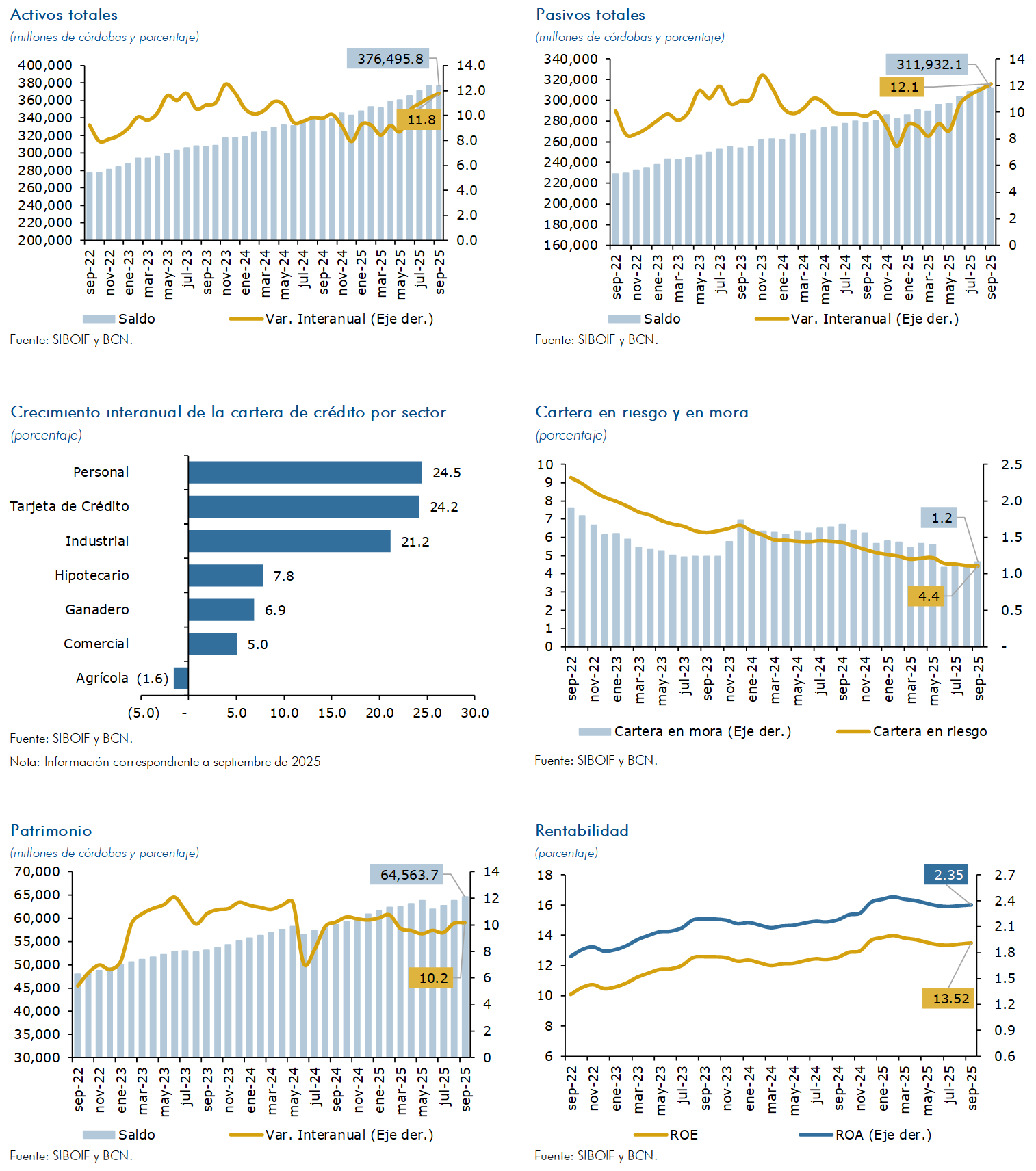 Al cierre de septiembre de 2025, los depósitos del público registraron un crecimiento de 13.5 por ciento en términos interanuales (saldo de C$266,388.0 millones); mientras la cartera de crédito aumentó en 12.9 por ciento (saldo de C$226,420.1 millones). Las entregas de crédito mantuvieron los buenos resultados registrados en la calidad de la cartera, así, la proporción de la cartera vigente se mantuvo en 95.6 por ciento de la cartera bruta total, mientras el ratio de cartera en mora se ubicó en 1.2 por ciento (1.7% en septiembre de 2024).