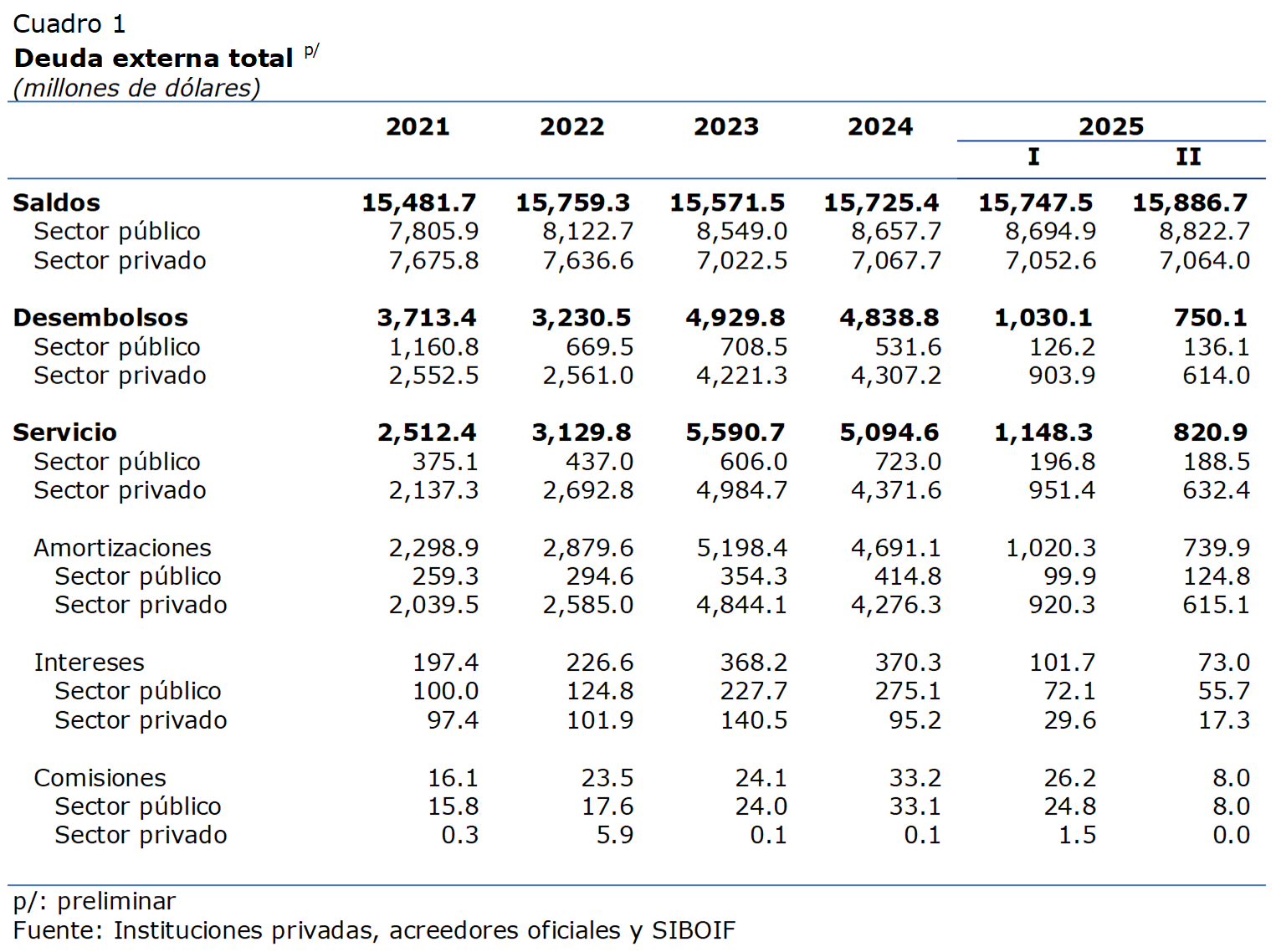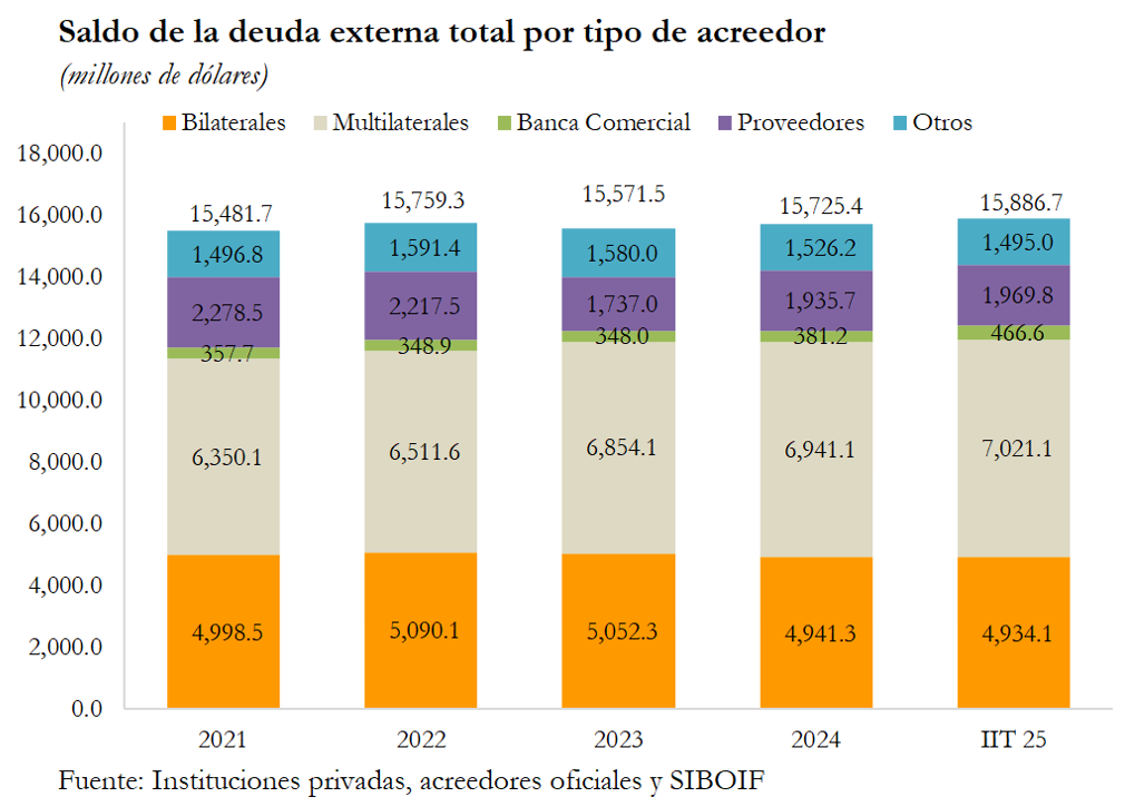 El saldo de la deuda externa total al segundo trimestre 2025 fue de 15,886.7 millones de dólares, de los cuales 55.5 por ciento (US$8,822.7 millones) correspondió al sector público y 44.5 por ciento (US$7,064.0 millones) al sector privado. Del total de la deuda externa, 44.2 por ciento fue deuda con acreedores oficiales multilaterales, 31.1 por ciento con acreedores oficiales bilaterales, 21.8 por ciento con proveedores y otros (incluye créditos comerciales con empresas relacionadas) y 2.9 por ciento con banca comercial.