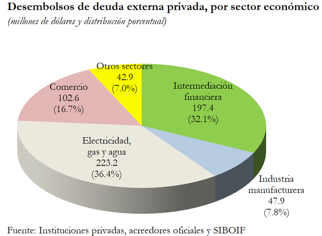 Los desembolsos provinieron principalmente de acreedores privados, de los cuales 65.8 por ciento fueron de proveedores y 22.8 por ciento de banca comercial, entre otros. Los principales destinos de los desembolsos recibidos por el sector privado fueron las actividades de electricidad, gas y agua (36.4%), intermediación financiera (32.1%), comercio (16.7%), industria manufacturera (7.8%), minería (6.7%) y el resto de sectores (0.3%).