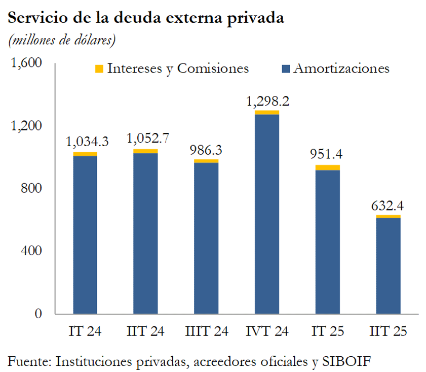 El servicio pagado de la deuda externa privada fue de 632.4 millones de dólares, 420.3 millones menos que en el mismo período de 2024. Del total pagado, 615.1 millones de dólares correspondieron a amortizaciones y 17.3 millones de dólares a intereses y comisiones. El 87.5 por ciento del servicio fue por deuda de corto plazo (US$553.1 millones) y el 12.5 por ciento restante fue de mediano y largo plazo (US$79.3 millones).
