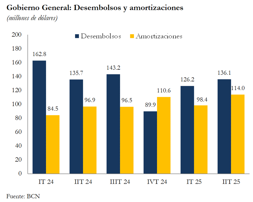 Los desembolsos de préstamos externos recibidos en el segundo trimestre 2025 fueron de 136.1 millones de dólares, siendo mayores en 0.4 millones (+0.3%) con respecto a igual período de 2024 (US$135.7 millones).