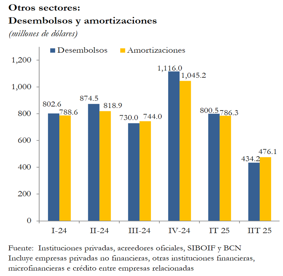 Los desembolsos de deuda externa de Otros Sectores fueron de 434.2 millones de dólares, representando una disminución de 440.2 millones (-50.3%) con respecto al mismo período de 2024 (US$874.5 millones).