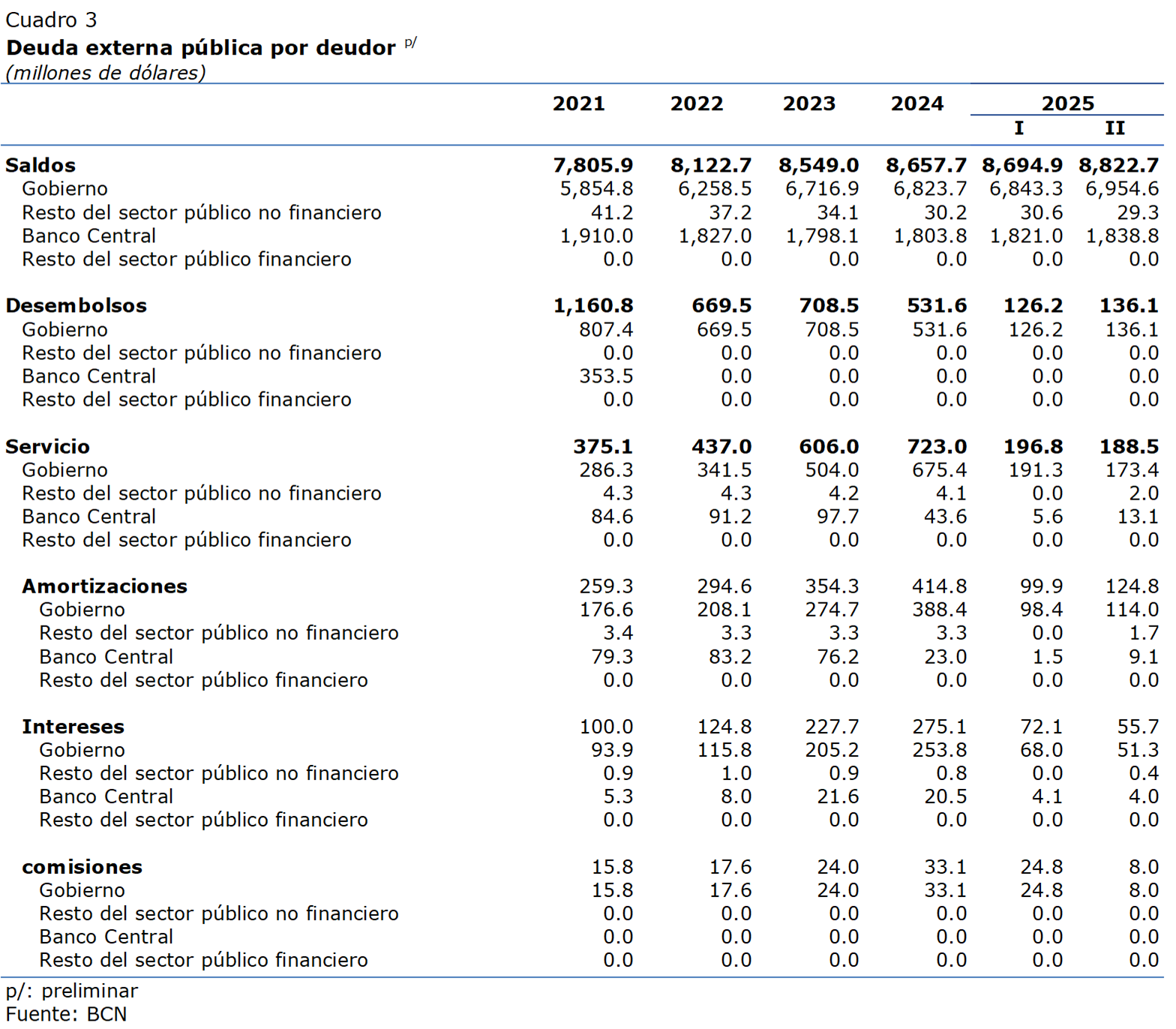 Del total de la deuda, 1,314.7 millones de dólares (71.5%) son préstamos, 516.0 millones de dólares son Asignaciones de Derechos Especiales de Giro (28.1%) y 8.1 millones de dólares son títulos de deuda (0.4%). El servicio pagado de la deuda externa del BCN fue de 13.1 millones de dólares (US$12.9 millones en el mismo período de 2024).