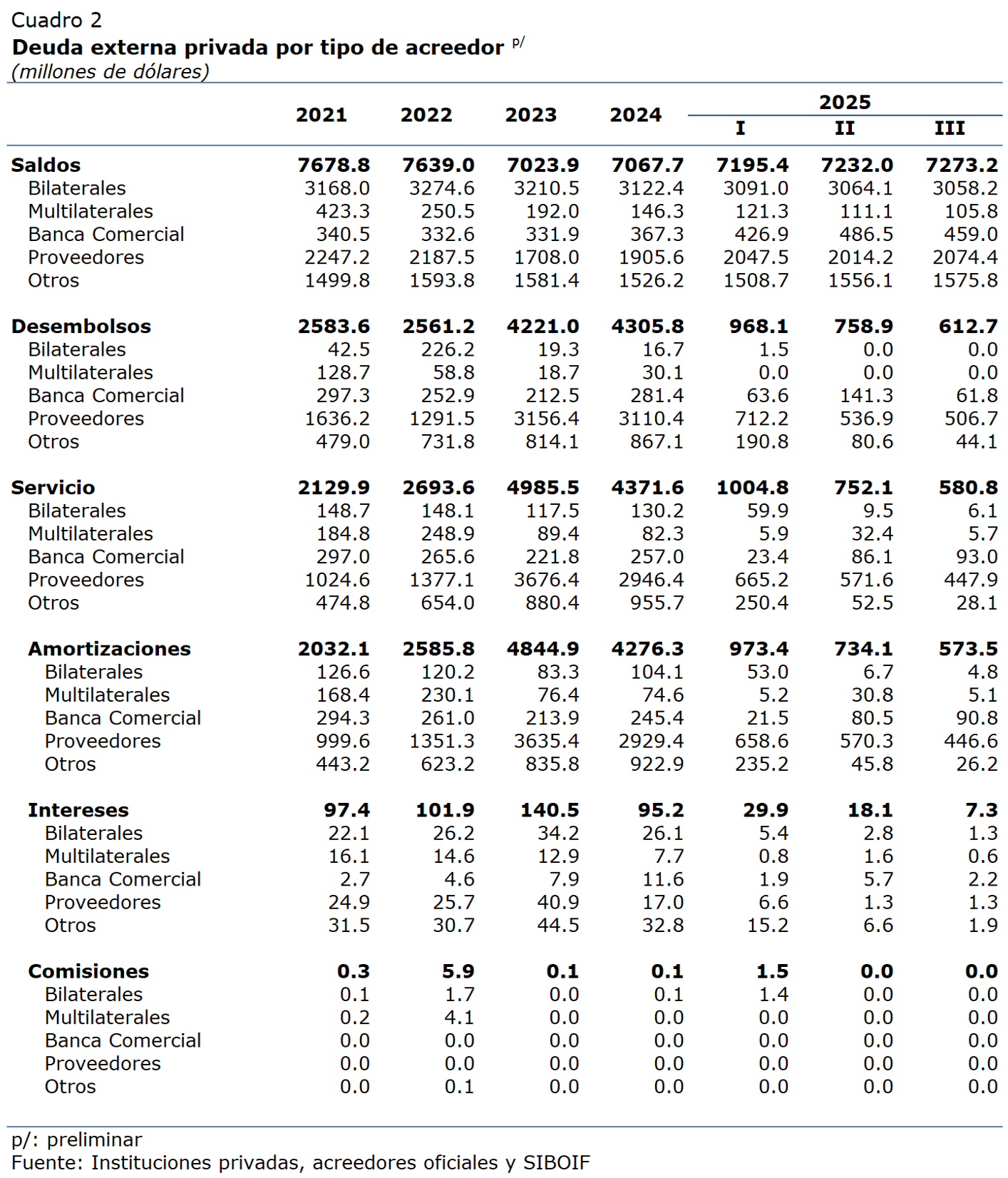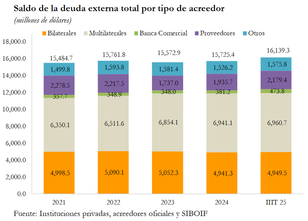 El saldo de la deuda externa total, al tercer trimestre 2025, fue de 16,139.3 millones de dólares, de los cuales 54.9 por ciento (US$8,866.1 millones) correspondió al sector público y 45.1 por ciento (US$7,273.2 millones) al sector privado. Del total de la deuda externa, 43.1 por ciento fue deuda con acreedores oficiales multilaterales, 30.7 por ciento con acreedores oficiales bilaterales, 23.3 por ciento con proveedores y otros (incluye créditos comerciales con empresas relacionadas) y 2.9 por ciento con banca comercial.