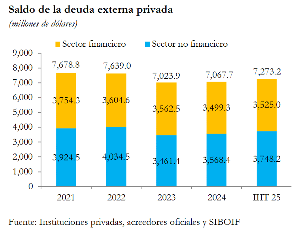 Al tercer trimestre de 2025, la deuda externa privada se ubicó en 7,273.2 millones de dólares, reflejando un aumento de 41.2 millones de dólares (+0.6%) con respecto al trimestre previo (US$7,232.0 millones).