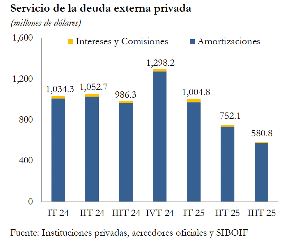 El servicio pagado de la deuda externa privada fue de 580.8 millones de dólares, 405.6 millones menos que en el mismo período de 2024. Del total pagado, 573.5 millones de dólares correspondieron a amortizaciones y 7.3 millones de dólares a intereses y comisiones. El 87.7 por ciento del servicio fue por deuda de corto plazo (US$509.4 millones) y el 12.3 por ciento restante fue de mediano y largo plazo (US$71.4 millones).