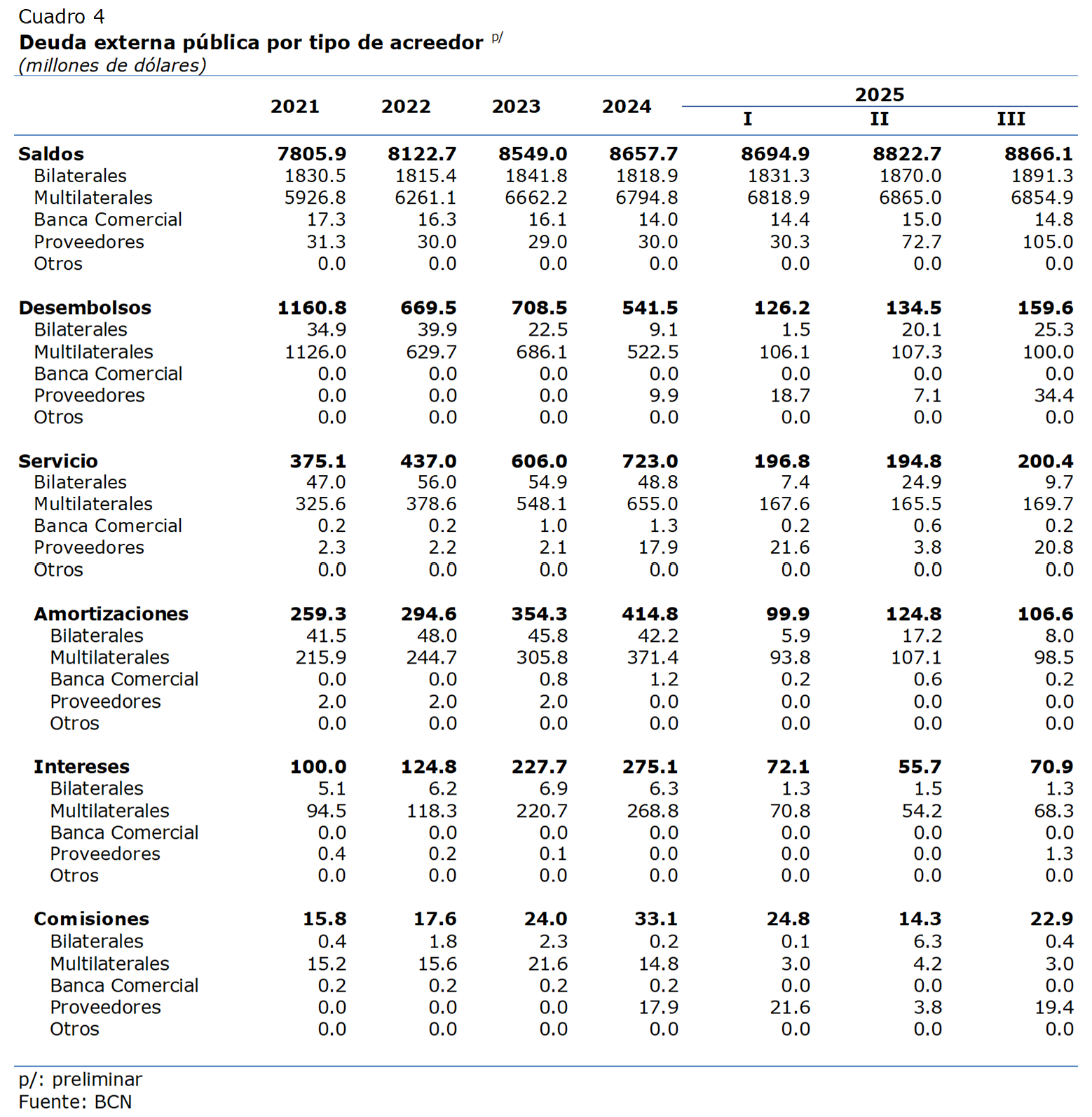 Del saldo total de la deuda, 1,323.2 millones de dólares (71.7%) son préstamos, 514.8 millones de dólares son Asignaciones de Derechos Especiales de Giro (27.9%) y 8.2 millones de dólares son títulos de deuda (0.4%). El servicio pagado de la deuda externa del BCN fue de 5.3 millones de dólares (US$8.7 millones en el mismo período de 2024).