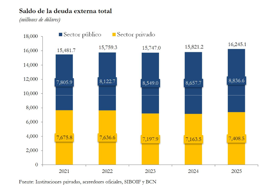 La deuda externa total aumentó en 423.8 millones de dólares (+2.7%) con respecto al saldo del año 2024 (US$15,821.2 millones), como resultado de aumentos de 245.0 millones en la deuda externa privada y de 178.9 millones en la deuda externa pública. La deuda externa total aumentó en 84.5 millones de dólares (+0.5%) con respecto al saldo del trimestre anterior (US$16,054.8 millones), como resultado de aumentos de 43.3 millones en la deuda externa pública y de 41.2 millones en la deuda externa privada.