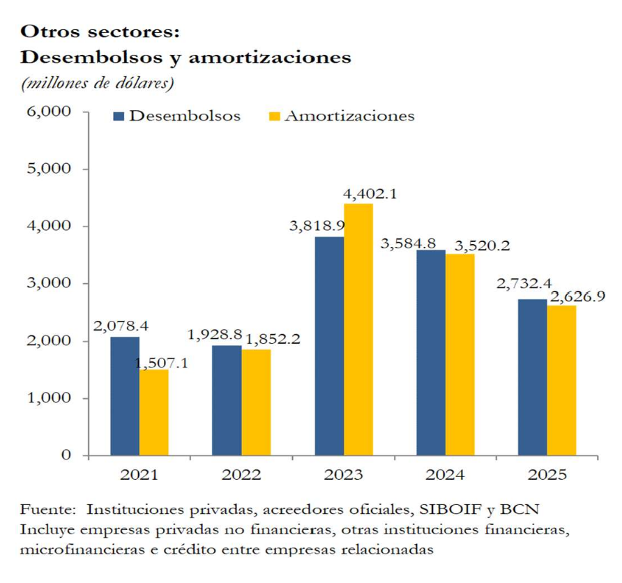 En el 2025, los desembolsos de deuda externa al sector privado fueron de 3,372.9 millones de dólares, reflejando una disminución de 996.1 millones (-22.8%) con respecto al 2024 (US$4,369.0 millones).