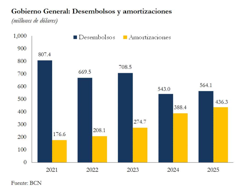 El servicio pagado de la deuda externa del Gobierno General fue de 739.1 millones de dólares, 63.9 millones más que en el 2024 (US$675.2 millones). Del total del servicio pagado, 436.3 millones de dólares correspondieron a amortizaciones y 302.8 millones de dólares a intereses y comisiones.