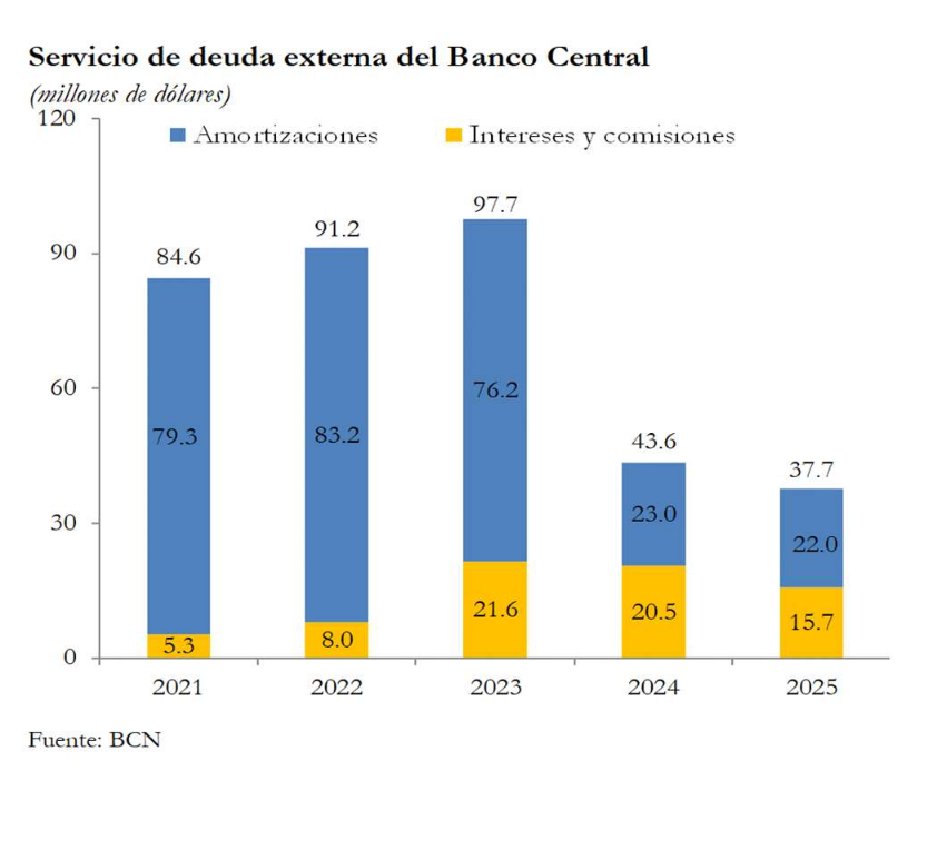 Del saldo total de la deuda, 1,323.3 millones de dólares (71.7%) son préstamos, 514.6 millones de dólares son Asignaciones de Derechos Especiales de Giro (27.9%) y 8.2 millones de dólares son títulos de deuda (0.4%). El servicio pagado de la deuda externa del BCN fue de 37.7 millones de dólares (US$43.6 millones en el mismo período de 2024).