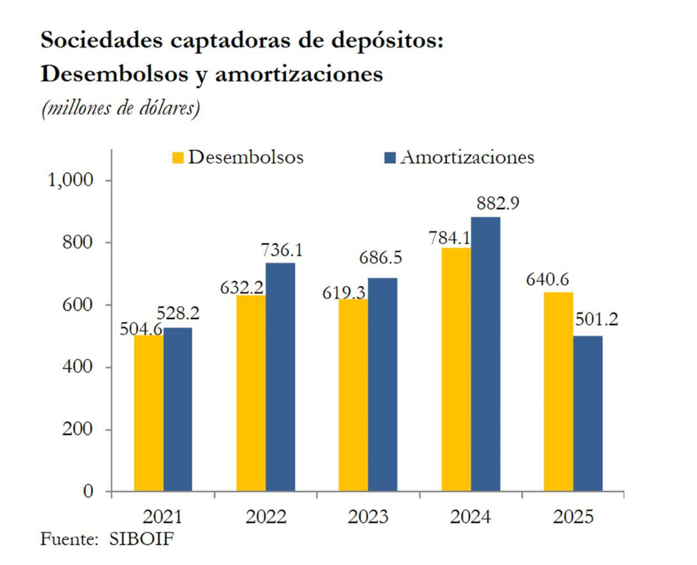 A diciembre 2025, la deuda externa de las Sociedades captadoras de depósitos fue de 648.0 millones de dólares, mostrando un aumento de 140.3 millones (+27.6%) respecto al año anterior (+US$507.7 millones). En cuanto a la distribución por plazo, 332.8 millones de dólares corresponden a deuda de corto plazo y 315.2 millones a deuda de mediano y largo plazo. Por tipo de instrumento, 615.8 millones de dólares correspondieron a préstamos y 32.2 millones a monedas y depósitos.