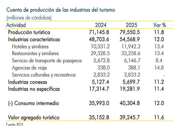 Como resultado de la producción, se generó un Valor Agregado Turístico (VAT) de 39,245.7 millones de córdobas, que representó 5.4 por ciento del valor agregado total de la economía, y registró un crecimiento de 11.6 por ciento con respecto al valor registrado en 2024 (C$ 35,152.8 millones).