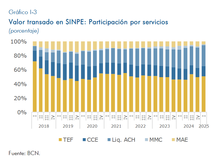 Al final del primer trimestre de 2025, se registraron 3.2 millones de tarjetas de pago (débito, crédito y prepagadas) en circulación (un incremento interanual de 13.3%); 436,410 cuentas de dinero electrónico (incremento de 39.7%) y 835,344 usuarios de carteras digitales registrados (incremento de 38.5%). El instrumento de pago más utilizado continúa siendo la tarjeta de débito, a través de las cuales se registraron 30.3 millones de transacciones (incremento interanual de 5.0%). Por su parte, en términos de monto, las transferencias entre cuentas en el mismo banco fueron las más representativas (71.1% del valor total).