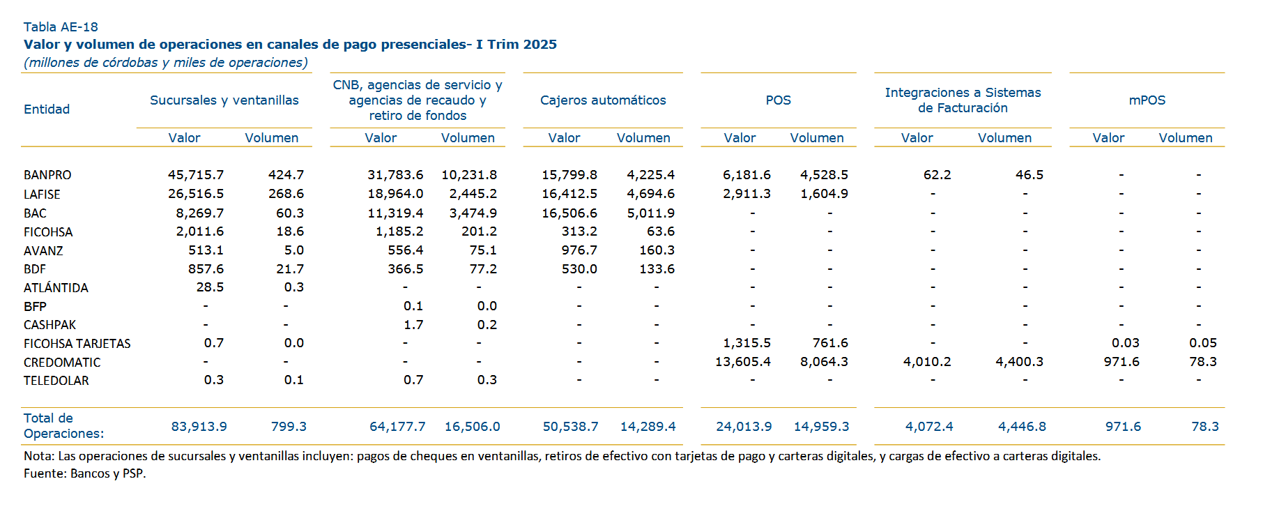 Durante el primer trimestre de 2025 se realizaron 51.1 millones de operaciones a través de canales de pago presenciales, lo cual representó un incremento interanual de 13.9 por ciento. El valor de dichas operaciones ascendió a 227,688.3 millones de córdobas (una disminución de 8.5 por ciento).