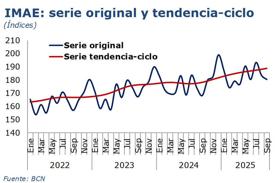 En la serie desestacionalizada del IMAE se registró un crecimiento de 0.6 por ciento respecto al mes anterior y de 6.2 por ciento con relación a septiembre de 2024. Por su parte, en la serie de tendencia-ciclo se observó un crecimiento de 0.4 por ciento con relación a agosto y de 5.9 por ciento respecto a septiembre de 2024.