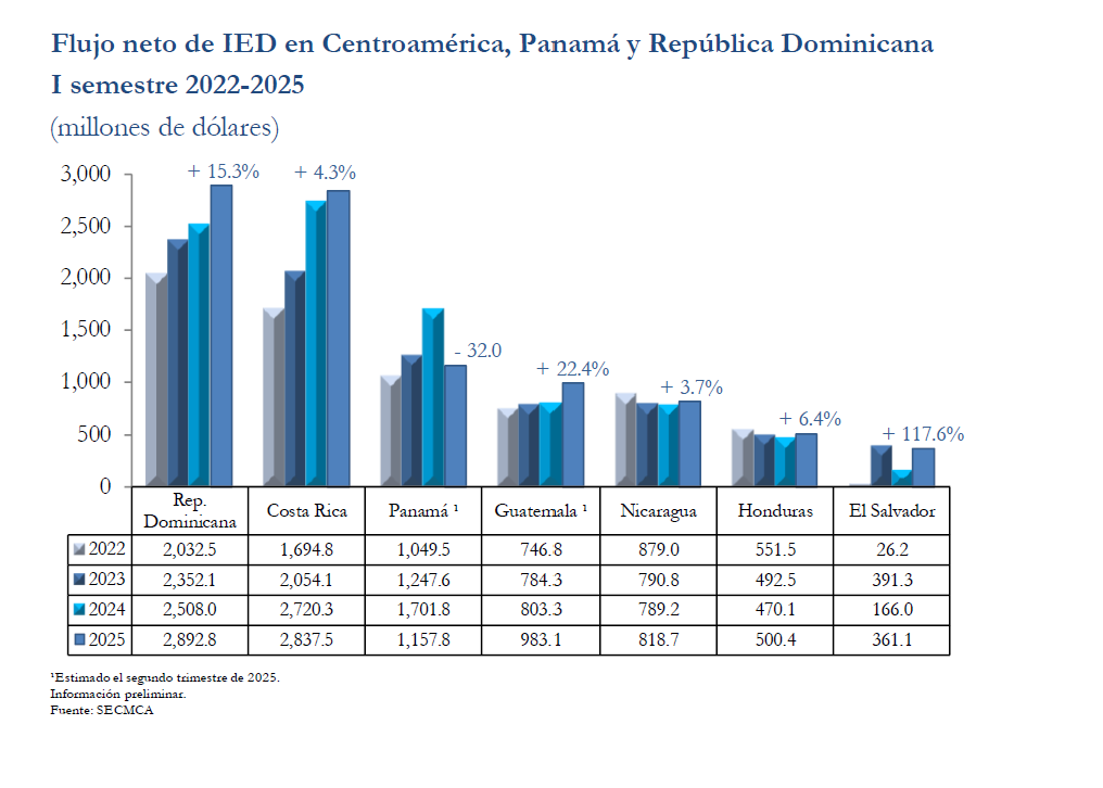 Durante el primer semestre de 2025, los flujos netos de Inversión Extranjera Directa (IED) que ingresaron a la región conformada por Centroamérica, Panamá y República Dominicana alcanzaron un monto total de 9,551.4 millones de dólares. Los principales países receptores fueron República Dominicana (30.3% del total), Costa Rica (29.7%), Panamá (12.1%), Guatemala (10.3%) y Nicaragua (8.6%).