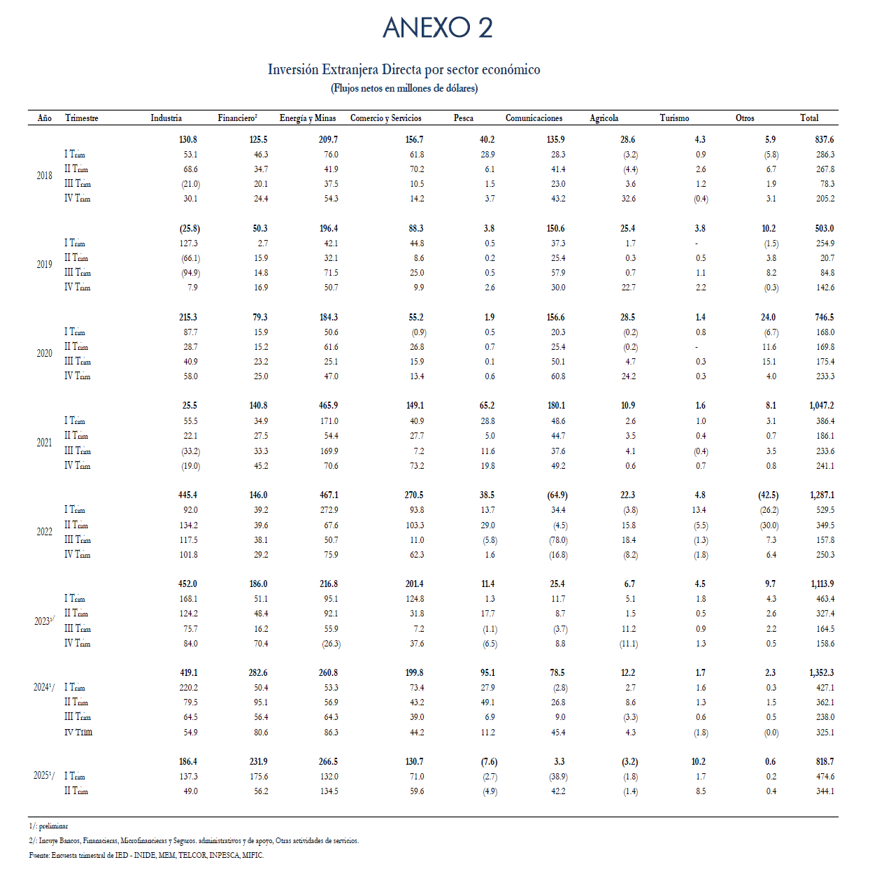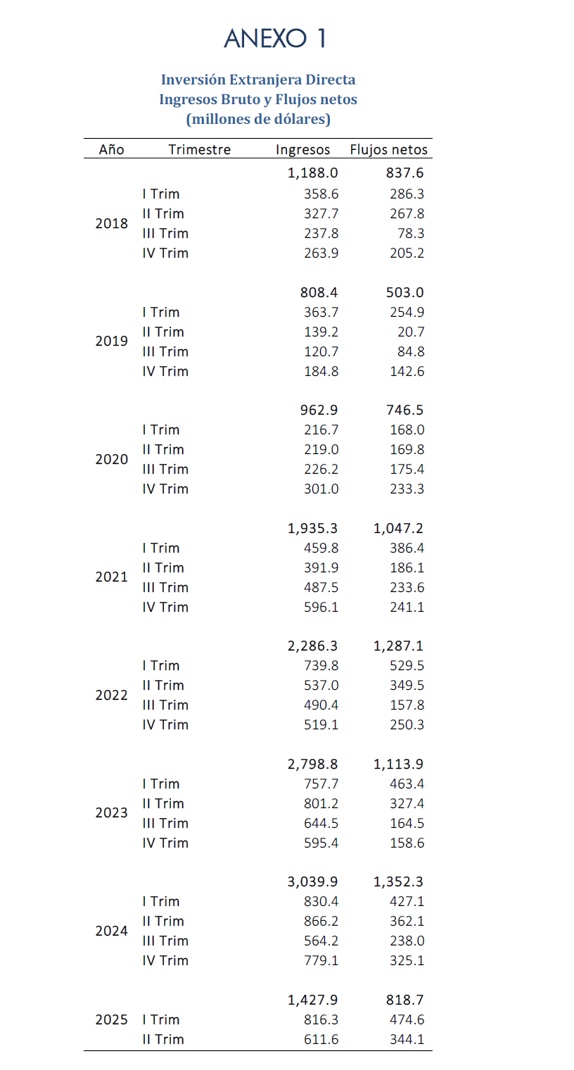 En el primer semestre del año, el ingreso bruto de IED ascendió a 1,427.9 millones de dólares (US$ 1,696.6 millones en primer semestre de 2024). Por su parte, el flujo neto de IED fue de 818.7 millones de dólares, mayor en 3.7 por ciento (+US$ 29.5 millones) respecto a igual período de 2024 (US$ 789.2 millones).