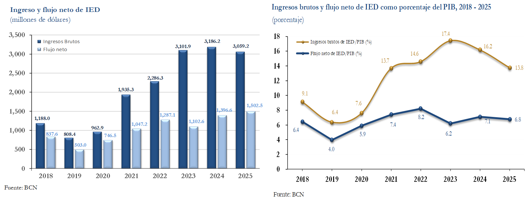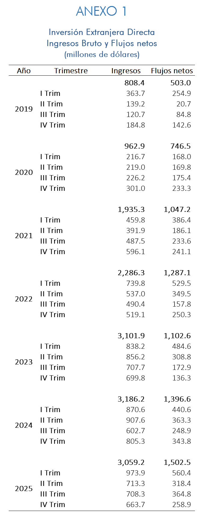 De manera que, en el año 2025, el ingreso bruto de IED totalizó 3,059.2 millones de dólares, siendo menor en 4.0 por ciento respecto a 2024 (US$ 3,186.2 millones); mientras que el flujo neto de IED resultó de 1,502.5 millones de dólares, mayor en 7.6 por ciento con relación a 2024 (US$ 1,396.6 millones).