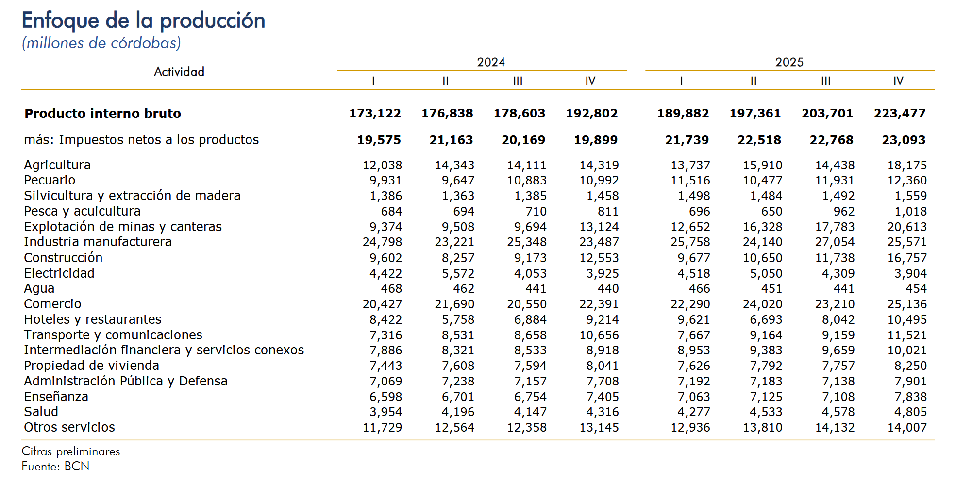 La agricultura creció 0.6 por ciento (disminución de 2.9% en promedio anual), como resultado del aumento de las labores en cultivos como café, caña de azúcar y banano. La actividad pecuaria creció 7.1 por ciento (6.3% en promedio anual), debido a la mayor matanza vacuna, y avícola, y aumento en la producción de huevos. No obstante, se registró disminución en la producción de leche y matanza porcina. La actividad de silvicultura y extracción de madera disminuyó 2.6 por ciento (-2.1% en promedio anual), como resultado de menor extracción de troncos de madera y leña. La pesca y acuicultura creció 2.7 por ciento (-10.2% en promedio anual), debido a mayor captura de langosta, peces y camarón. Por otra parte, se registró disminución en la producción de camarón de cultivo y en la captura de caracol y cangrejo La explotación de minas y canteras creció 0.4 por ciento (7.4% en promedio anual), como resultado de la mayor extracción de plata, hormigón, piedra triturada y sal; y disminuciones en la extracción de oro, arena, piedra cantera, yeso, toba y piedra pómez. La industria manufacturera creció 8.2 por ciento (5.1% en promedio anual). Este comportamiento fue resultado de la mayor producción en productos cárnicos, azúcar, tabaco, derivados de petróleo, y maquinaria y equipos, principalmente. | La actividad de construcción creció 26.7 por ciento (17.3% en promedio anual), como resultado de mayor construcción privada y pública. La construcción privada registró aumento en el área efectivamente construida en el destino de construcción residencial. Por su parte, en la construcción pública se observó crecimiento en las obras de ingeniería civil y en las edificaciones no residenciales. La generación de electricidad disminuyó 3.7 por ciento (-5.6% en promedio anual), debido a la menor generación de energía hidroeléctrica y geotérmica, principalmente. El servicio de agua registró un crecimiento de 8.4 por ciento (4.3% en promedio anual). El comercio creció 9.9 por ciento (9.3% en promedio anual), como resultado del aumento del comercio al por mayor y al por menor. La actividad de hoteles y restaurantes creció 8.0 por ciento (8.0% en promedio anual). La actividad de transporte y comunicaciones creció 6.3 por ciento (5.0% en promedio anual), debido a aumentos, tanto en los servicios de transporte, como en la actividad de comunicación. |