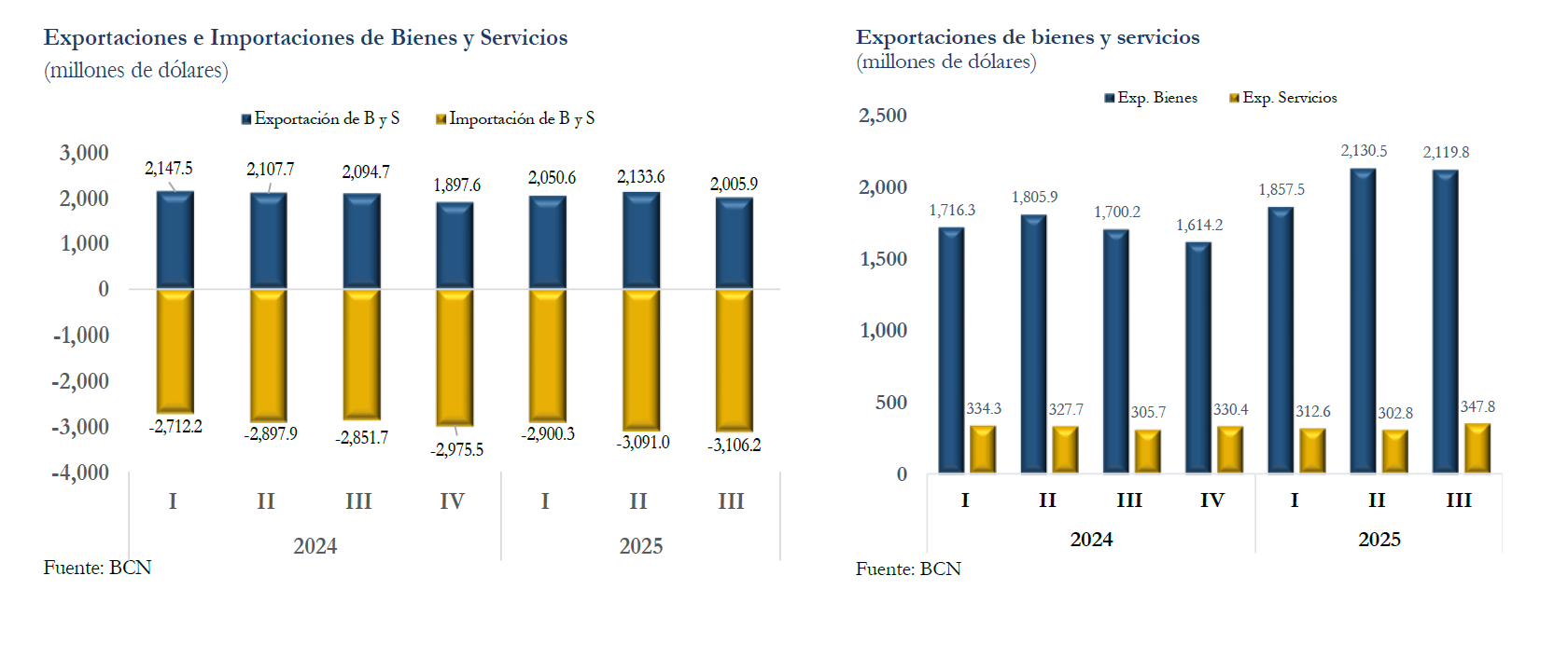 En el tercer trimestre de 2025, en la cuenta corriente de la balanza de pagos, se registraron exportaciones de bienes por el monto de 2,119.8 millones de dólares, superiores en 24.7 por ciento en términos interanuales (US$1,700.2 millones en el III trimestre 2024), e importaciones de bienes por 2,731.2 millones de dólares, las que fueron mayores en 8.2 por ciento al tercer trimestre de 2024 (US$2,524.2 millones). De esta manera, el balance comercial de bienes fue deficitario en 611.4 millones de dólares, menor en 25.8 por ciento al registrado en igual trimestre de 2024 (US$824.0 millones).