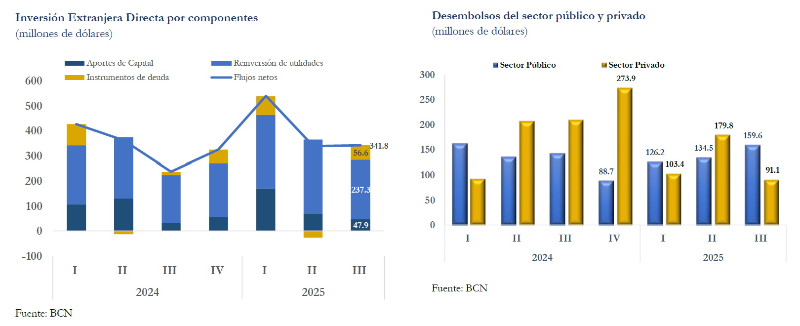 Por su parte, la cuenta financiera registró un flujo neto positivo de 175.1 millones de dólares en el trimestre, para un acumulado de 662.4 millones al tercer trimestre de 2025, resultados contrario al endeudamiento neto observado en igual período del año pasado.