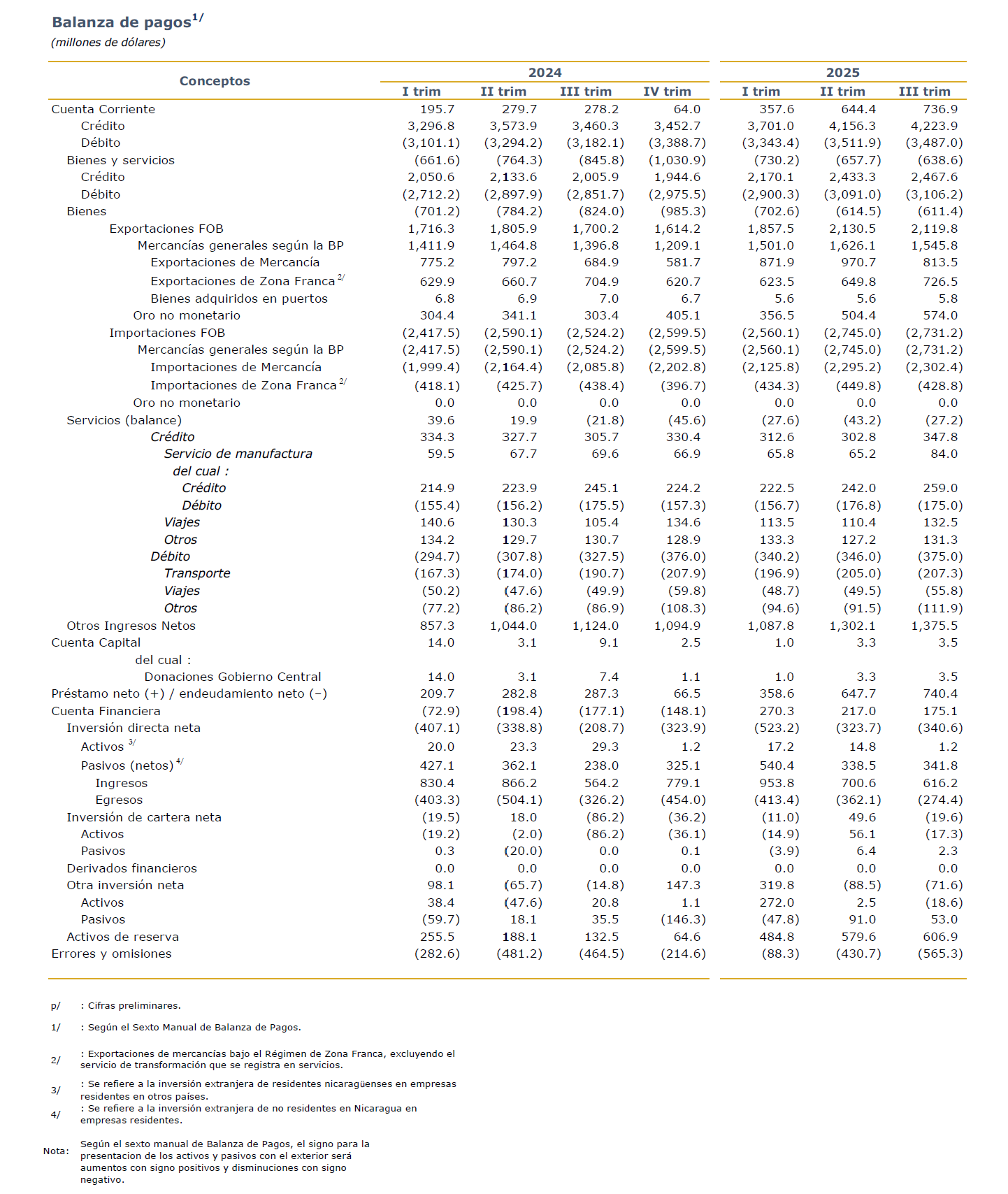 Los activos de reserva del BCN aumentaron 606.9 millones de dólares en el tercer trimestre de 2025 (US$615.5 millones en RIB); y 1,671.3 millones en el periodo enero-septiembre, que en términos de RIB significó un incremento acumulado de 1,716.5 millones de dólares, las que finalizaron con un saldo de 7,821.6 millones de dólares.